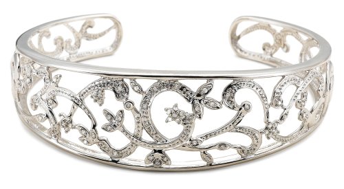 With its beautiful floral-vine openwork design, and sparkling diamond accents, this sterling silver cuff-style bracelet adds a glamorous note to a special outfit. The 7-inch bracelet has a width of just over 2 1/2 inches, with tapered rounded ends for a comfortable feel on the wrist. It shimmers with 60 round diamonds (1/4 cttw) and boasts an attractive polished finish.